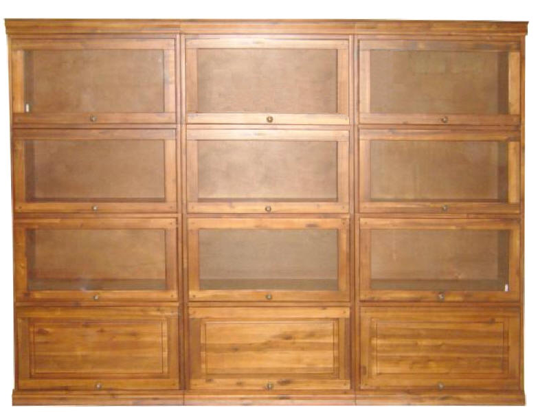 kirjahyllykokonaisuus, johon kuuluu lasi- ja puuovellisia kaappeja